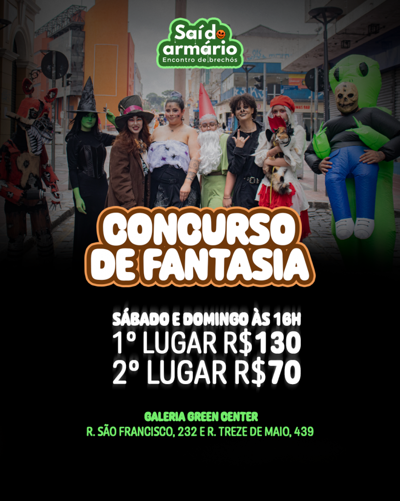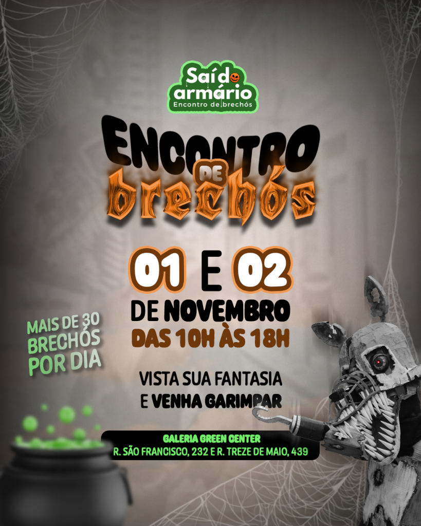 Nos dias 1º e 2 de novembro, das 10h às 18h, a Galeria Green Center recebe uma edição especial do Encontro de Brechós Saí do Armário, com atmosfera de Halloween, garimpo sustentável, moda feminina, masculina e infantil e um convidativo Concurso de Fantasias aberto a todos os visitantes.